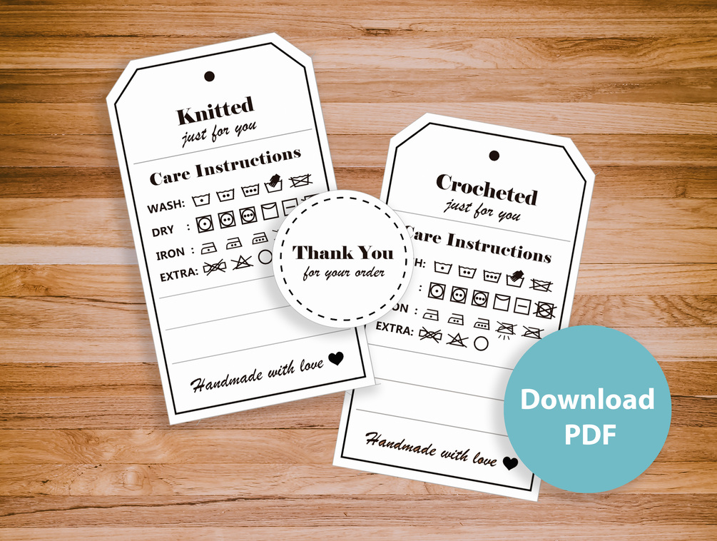 ♥ This product is a digital file with tags for putting in your finished crocheted and knitted projects. These tags show the care instructions for your creations, and you can write any other additional detail like the price, the material, your name, etc.